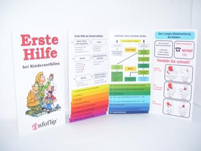 Infoflip Erste-Hilfe am Kind ist ein tolles Nachschlagewerk. Durch seine Falttechnik sind Begriffe leicht zu finden. Mit seinem DIN lang Format passt es in jede Jackentasche.