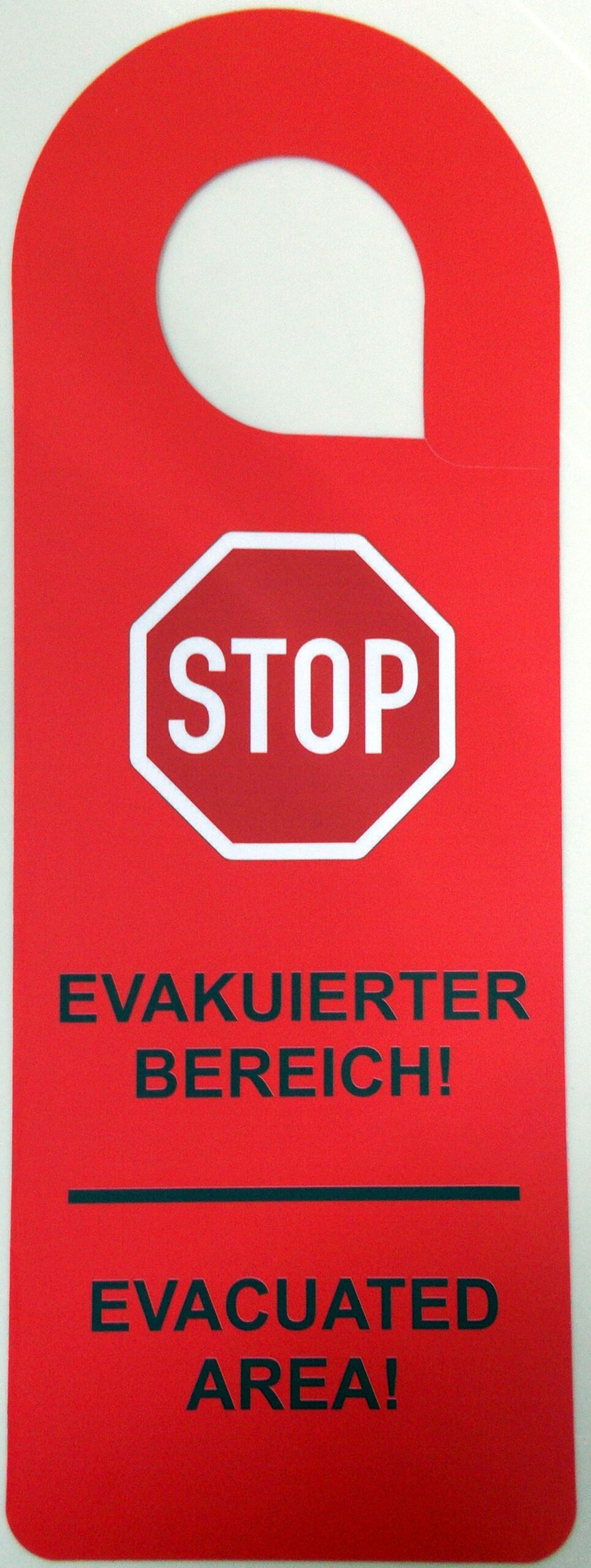 Türanhänger mit beidseitigem Aufdruck EVAKUIERT in Deutsch und Englisch in der Signalfarbe rot